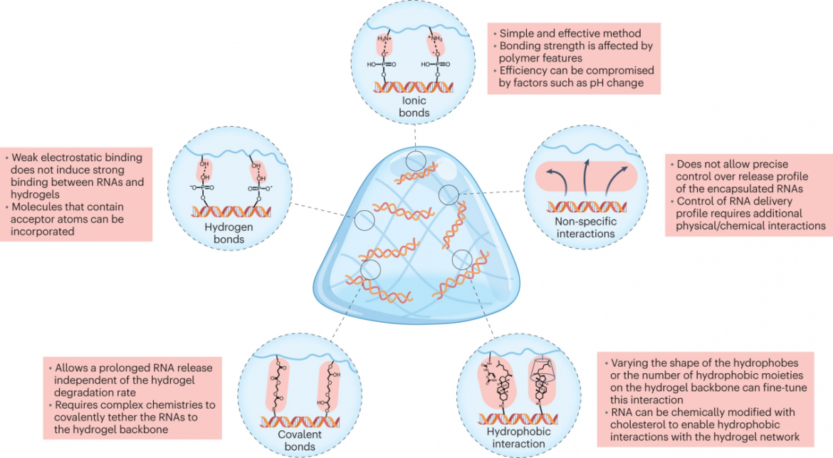 带中性电荷的聚合物如聚乙烯醇(PVA)可以通过正氢原子的相互作用与核酸结合,这与带负电的受体原子建立静电连接。这种聚合物可以用某些化学部分进一步修饰,以增加水凝胶和RNA之间的分子间氢键相互作用。同样,带负电荷的多糖如藻酸盐和透明质酸(HA)已被探索用于促进RNA的受控释放,RNA也可以用其他部分进行修饰,以增加与封装核酸的氢键数量。例如,HA-PVA水凝胶在体外释放siRNA的速度比PVA水凝胶慢,这归因于siRNA和HA主链之间的氢键数量较多。需要强调的是,氢键主要是弱静电相互作用,可能不会诱导RNA与水凝胶的强烈结合。因此,有时通过向水凝胶配方中添加阳离子分子或聚合物,氢键和离子键结合起来以增强水凝胶和RNA之间的相互作用。