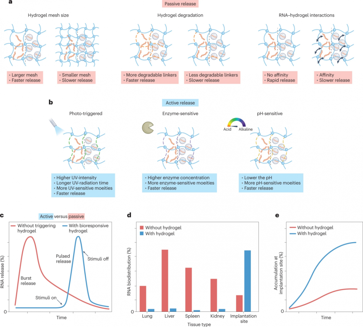 为了解决与被动释放相关的问题,使用主动释放机制实现了水凝胶中RNA的按需递送。主动释放是响应内部(例如pH和酶)或外部刺激(例如光辐射)而实现的,这可以促进水凝胶网络的按需降解,从而促进RNA释放。通过外部刺激触发RNA释放,引入了对特定剂量和特定时期内RNA递送的额外控制,为医生或患者递送策略提供了替代方案。