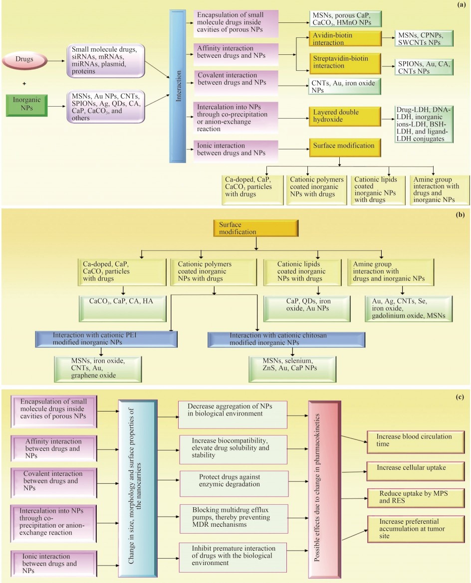 (b)无机纳米颗粒和药物之间的不同表面改性方法。