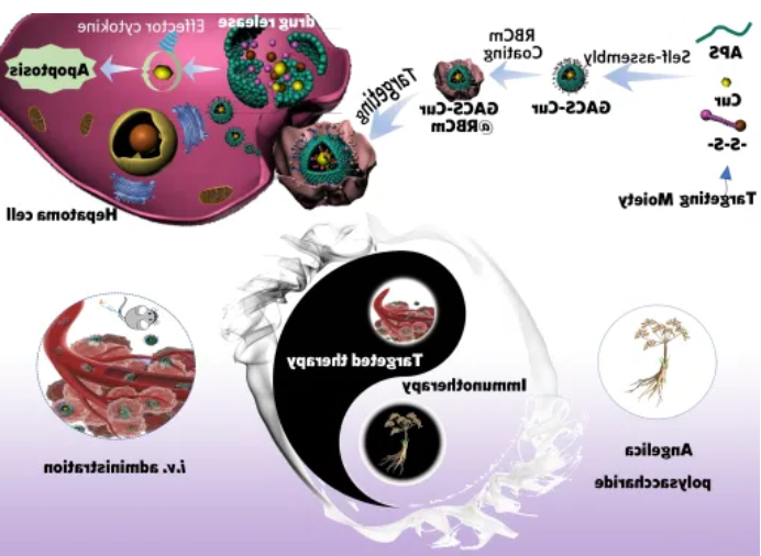 红细胞膜(RBCm)包裹负载姜黄素的甘草次酸-二硫键(DTA)-当归多糖自组装纳米胶束(GACS-Cur@RBCm)是一种智能仿生纳米递送系统,旨在提高姜黄素(Cur)的生物利用度和抗肿瘤效果。该胶束以当归多糖(APS)为亲水骨架,甘草次酸(GA)为疏水核心,通过二硫键(DTA)交联形成稳定的纳米结构,并利用姜黄素与GA之间的疏水相互作用及π-π堆积负载药物。DTA的引入赋予胶束肿瘤微环境响应性,在高谷胱甘肽(GSH)水平的肿瘤环境中可断裂释放姜黄素,实现精准药物递送。外层红细胞膜(RBCm)包裹进一步赋予胶束免疫逃逸能力,减少被巨噬细胞吞噬,延长体内循环时间,并提高肿瘤靶向性。GACS-Cur@RBCm结合了仿生屏障保护、肿瘤微环境响应和中药活性成分协同作用,为姜黄素的高效递送和抗肿瘤治疗提供了一种创新策略。
