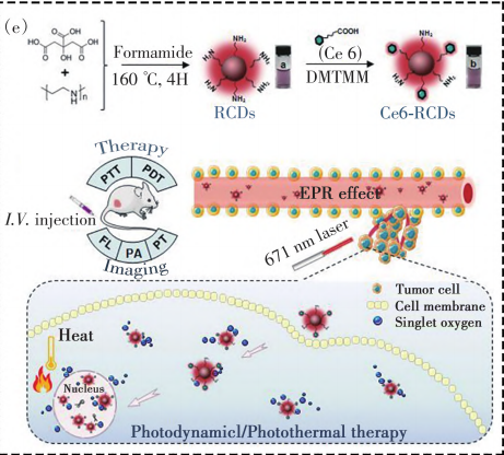 红色碳量子点(RCD)包载光敏剂氯素E6(Ce6)是一种结合了纳米材料和光动力治疗技术的创新复合材料。RCD是一种具有优异光学特性、良好生物相容性和稳定性的碳基纳米材料,其在近红外区域(NIR)具有显著的荧光和光声成像能力,可用于多模态成像。Ce6是一种常用的光敏剂,在激光照射下能够激活生成单态氧,具有光动力治疗(PDT)的效果。在RCD的包载下,Ce6不仅能够提高其生物分布和靶向性,还能增强治疗效果。通过近红外激光(671 nm)的照射,RCD不仅在光热治疗(PTT)中表现出优秀的光热效应,帮助局部加热杀伤癌细胞,同时Ce6在照射下能够激活光动力效应,产生细胞毒性单态氧,对肿瘤细胞进行治疗。此外,RCD包载Ce6还具有多模态成像能力,包括荧光成像(FL)、光声成像(PA)和光热成像(PT),能够实时监测治疗过程,提供治疗效果的可视化。该复合材料为癌症的精准治疗与成像引导提供了新的策略,具有很好的临床应用前景。