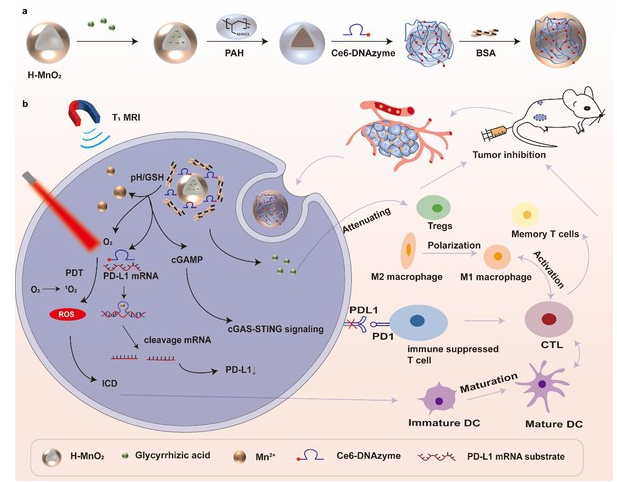 具有ROS响应型的中空二氧化锰(HMnO2)纳米粒是一种集成了光动力治疗、基因调控和免疫调节功能的多模态纳米递药系统,能够在肿瘤微环境中触发高效药物释放。HMnO2纳米粒具有独特的中空结构和ROS响应特性,能够在肿瘤高活性氧水平下降解,迅速释放包裹其中的氯化铈(Ce6)、脱氧核酶(DNAzyme)和甘草酸(GA)。Ce6作为光敏剂,在光照下生成活性氧,直接杀伤肿瘤细胞并引发免疫原性细胞死亡(ICD);DNAzyme通过靶向剪切肿瘤相关的RNA,进一步抑制肿瘤的增殖与转移;GA则通过其天然免疫调节和抗炎特性,改善肿瘤微环境,增强抗肿瘤免疫反应。这种多功能载体系统不仅能够实现肿瘤部位的精准药物释放,还能够通过协同机制显著增强光动力治疗和基因调控的抗肿瘤效果,为多模态抗肿瘤治疗提供了一种创新的纳米递药策略。