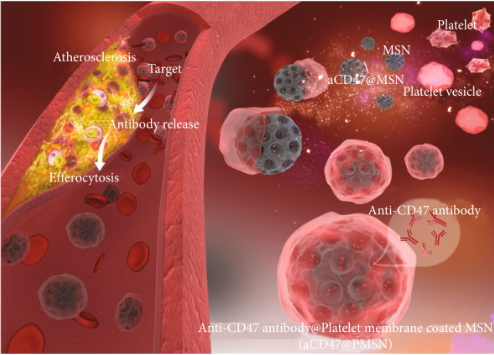 血小板膜包裹负载anti-CD47抗体的介孔二氧化硅纳米颗粒是一种仿生纳米药物递送系统,旨在靶向治疗肿瘤和动脉粥样硬化等疾病。介孔二氧化硅(MSN)纳米颗粒作为载体,具有高比表面积和良好的药物负载能力,能够高效封装和保护抗CD47抗体。抗CD47抗体通过阻断肿瘤细胞表面的CD47信号,解除其“不要吃我”信号,促进巨噬细胞介导的吞噬作用。血小板膜包裹在纳米颗粒外层,赋予其免疫伪装特性和靶向能力,延长血液循环时间,减少免疫清除。血小板膜上的黏附分子,如P-选择素,使纳米颗粒能够特异性识别和定位于炎症或肿瘤部位,增强靶向递送效率。该仿生纳米系统通过整合免疫逃逸和肿瘤免疫激活功能,在抗肿瘤免疫治疗和动脉粥样硬化治疗中展现出广阔应用前景。