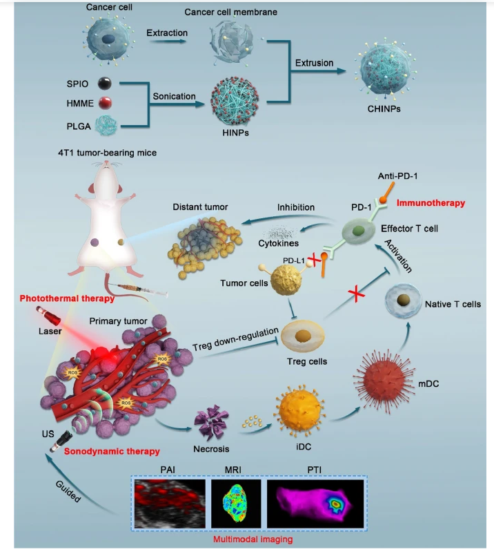 癌细胞膜包裹负载超顺磁性铁氧化物(SPIO)和血卟啉单甲醚(HMME)的聚乳酸-羟基乙酸共聚物(PLGA)纳米颗粒是一种集成成像、靶向与治疗功能的仿生纳米系统。该纳米颗粒以PLGA为核心,协同包载SPIO用于磁共振成像(MRI)导航,HMME作为声敏剂用于声动力治疗(SDT);外层包覆的癌细胞膜赋予其同源性识别能力,可主动靶向肿瘤组织并逃避免疫清除。该系统在超声和近红外激光刺激下依次激活HMME产生活性氧和诱导局部热效应,实现协同声光治疗;同时在成像引导下精准定位病灶,实现肿瘤原位清除并激发系统性抗肿瘤免疫,为恶性肿瘤的精准诊疗提供了一种高效、安全的新策略。