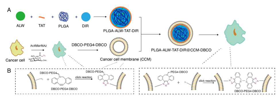 DBCO修饰的癌细胞膜(CCM)包裹的细胞穿膜肽(TAT)修饰负载小分子激酶抑制剂 (ALW)和DIR的PLGA纳米粒