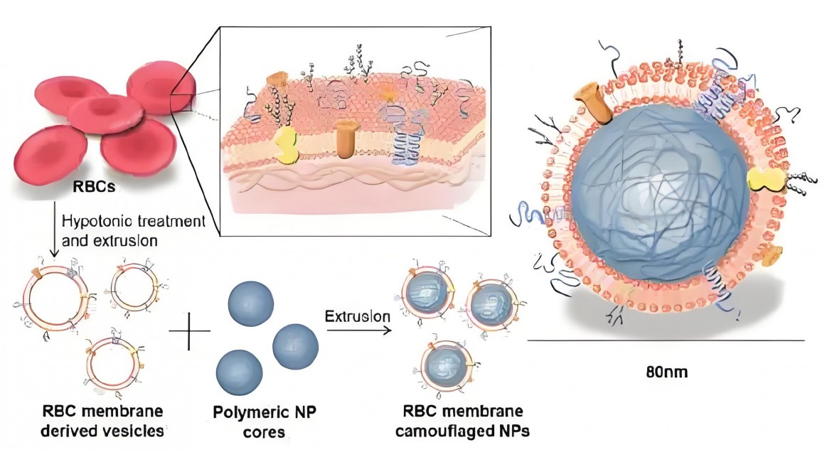 PLGA纳米粒是由聚乳酸-羟基乙酸(PLGA)合成的生物可降解纳米颗粒,广泛用于药物递送和生物医学应用,具有优良的生物相容性和控制释放特性。红细胞膜包裹PLGA纳米粒是一种新兴的药物递送系统,结合了红细胞膜的生物相容性和聚乳酸-羟基乙酸(PLGA)纳米粒的可控释放特性。这种系统利用红细胞膜的天然性质,可以有效地提高纳米粒的靶向性和生物稳定性,从而增强药物在体内的分布和治疗效果。此外,红细胞膜的特性有助于逃避免疫系统的监视,使得纳米粒能够更有效地穿越生物屏障,达到目标组织或细胞。