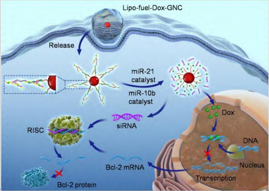DNA/RNA双链体是由一条DNA链与一条RNA链组成的分子结构,常用于基因沉默和RNA干扰治疗,而多柔比星(DOX)是一种常用的化疗药物,通过干扰DNA的复制和转录抑制肿瘤细胞增殖。DNA功能化的金纳米颗粒是通过在金纳米颗粒表面修饰DNA分子,赋予其靶向性和特异性,广泛应用于药物递送、基因治疗和生物传感等领域。负载DNA/RNA双链体和多柔比星(DOX)的DNA功能化金纳米颗粒是一种创新的纳米药物递送系统,通过将DNA/RNA双链体和化疗药物DOX负载在金纳米颗粒表面,结合基因治疗和化学治疗的双重疗效。金纳米颗粒通过DNA功能化修饰,使其能够靶向特定的肿瘤细胞,并通过RNA干扰技术实现基因沉默,而多柔比星则通过抑制DNA复制和转录对肿瘤细胞进行杀伤。这种系统利用DNA/RNA双链体的特性,在肿瘤细胞中特异性释放siRNA和DOX,从而增强治疗效果,克服耐药性,减少对正常细胞的毒性。
