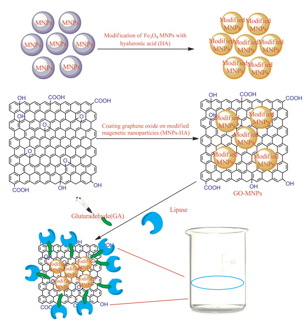 交联酶聚集体(CLEAs)与透明质酸(HA)修饰的磁性纳米颗粒(MNPs)与氧化石墨烯(GO)复合材料交联形成纳米复合物 GO-MNPs@HA-CLEAs