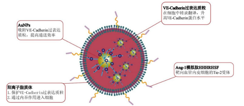 Ang-1 模拟肽 HHHRHSF修饰的阳离子脂质体包裹β-巯基乙胺和VE-Cadherin修饰的AuNPs