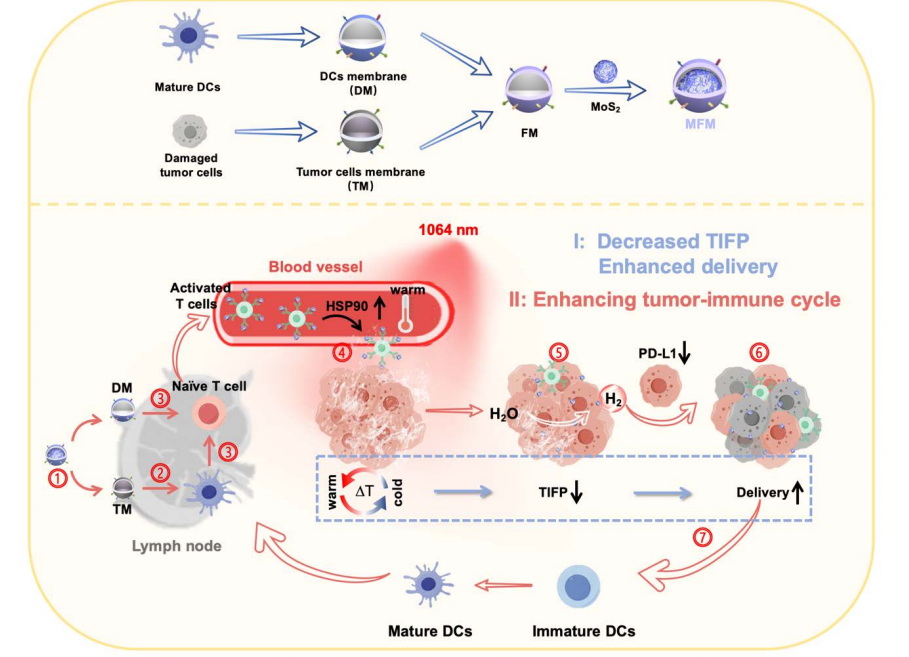 树突状细胞膜(DC Membrane, DM)和肿瘤细胞膜(Tumor Cell Membrane, TM)组成的仿生融合膜(Fusion Membrane, FM)包裹MoS2纳米颗粒,结合了树突状细胞膜的免疫激活能力和肿瘤细胞膜的肿瘤靶向特性。这种仿生融合膜能够通过树突状细胞膜的淋巴归巢效应将纳米颗粒引导到肿瘤引流淋巴结,并通过直接和间接的方式激活T细胞,促进其在肿瘤部位的渗透与积累。MoS2纳米颗粒在近红外光照射下通过光热效应升温,增强T细胞的迁移能力,并通过热电催化反应生成氢气(H2),进一步增强免疫治疗效果,并减少肿瘤细胞的免疫逃逸能力。