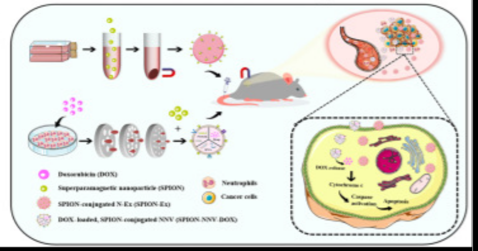 多柔比星(Doxorubicin,简称DOX)是一种广泛使用的化疗药物,具有抗肿瘤活性,通过抑制DNA合成和修复,诱导癌细胞凋亡。超顺磁性氧化铁纳米颗粒修饰的负载多柔比星的中性粒细胞外泌体样囊泡(SPIONs@NNVs-Dox)是一种创新的纳米药物递送系统,通过结合中性粒细胞外泌体样囊泡(NNVs)的天然靶向性和超顺磁性氧化铁纳米颗粒(SPIONs)的磁性特性,能够高效地将化疗药物多柔比星(DOX)精准递送到肿瘤部位。该系统利用SPIONs的磁性,在外部磁场的引导下增强药物的靶向性,同时中性粒细胞外泌体样囊泡的生物相容性和免疫逃逸特性使其能有效地在肿瘤微环境中积累,减少对正常细胞的毒性。通过这种双重靶向机制,SPIONs@NNVs-Dox显著提高了治疗效果,具有广泛的抗肿瘤潜力。