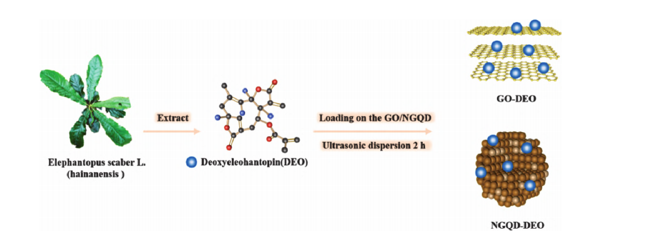 去氧地胆草内酯(Deoxyelephantopin,DEO)提取自天然植物地胆草,存在五元环内酯结构,可与石墨烯衍生物基面通过共轭作用相互吸引。负载去氧地胆草内酯的氮掺杂氧化石墨烯量子点(NGQD)是一种创新的纳米药物载体系统,结合了氮掺杂氧化石墨烯量子点的优异导电性和去氧地胆草内酯(DNR)的抗癌效果。氮掺杂氧化石墨烯量子点具有优异的电学、光学和化学性质,其中氮掺杂不仅优化了其电子结构,增强了量子点的亲水性,还能改善其生物相容性和稳定性。去氧地胆草内酯作为一种有效的抗癌药物,能抑制肿瘤细胞的增殖和促进细胞凋亡。通过将去氧地胆草内酯负载于氮掺杂氧化石墨烯量子点上,能够提高药物的生物利用度和释放控制,从而增强其抗癌疗效。该复合材料在靶向药物递送、肿瘤治疗中展现出极大的应用潜力。
