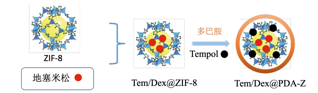 聚多巴胺PDA修饰负载抗氧化剂TempoI和地塞米松的ZIF-8 纳米粒子