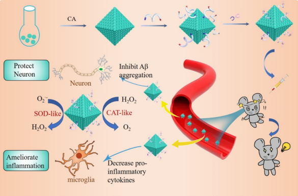 PEG聚乙二醇修饰的八面体钯 (Pd) 纳米酶负载中药成分冰片 (Bor)(PEG-Pd@Bor)是一种智能纳米递送系统,旨在增强药物穿透血脑屏障(BBB)并靶向神经元,提高中枢神经系统疾病的治疗效果。其中,八面体Pd纳米酶具有类过氧化物酶和抗氧化活性,可清除活性氧 (ROS),降低神经炎症,保护神经元免受损伤。PEG修饰赋予纳米酶 长效循环能力和良好的生物相容性,减少免疫清除,提高血液稳定性。而冰片 (Bor) 作为传统中药成分,具有穿透BBB的能力,可促进Pd 纳米酶高效进入大脑,增强靶向神经元的作用。PEG-Pd@Bor复合系统的结合为阿尔茨海默病(AD)、帕金森病(PD)等 神经退行性疾病提供了一种高效的精准治疗策略。