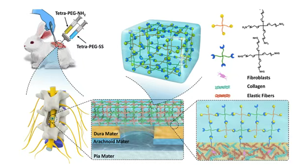 四臂聚乙二醇胺(tetra-PEG-NH₂)与四臂聚乙二醇琥珀酰亚胺活化酯(tetra-PEG-SS)在温和条件下通过伯胺与NHS酯之间的高效氨解反应迅速交联,形成一种结构均一、可注射的水凝胶。该水凝胶系统由两种低黏度溶液混合后即可在数秒内完成凝胶化,具备良好的流动性与操作性,适合通过注射器或微创装置实现原位成胶,真正实现“无缝注射”。交联形成的三维网络不仅赋予凝胶优异的机械性能和组织粘附性,还具有良好的生物相容性和可控的体内降解能力,使其特别适合用于硬脑膜修复、脑脊液封堵等对密封性和生物安全性要求极高的临床场景。