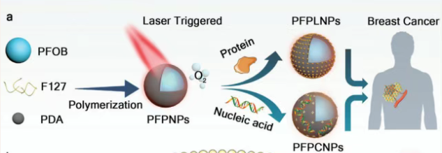 聚多巴胺包裹负载全氟溴辛烷的普朗尼克F127聚合物胶束是一种多功能、光热响应型纳米载体系统。该体系以嵌段共聚物F127(PEO-PPO-PEO)自组装形成胶束结构,包载疏水性含氟液体全氟溴辛烷(PFOB)于其疏水核中,用于高效储存氧气。随后通过多巴胺在碱性条件下氧化自聚,形成一层稳定的聚多巴胺(PDA)外壳,包裹整个胶束颗粒。PDA不仅增强纳米颗粒的结构稳定性和生物相容性,还具备良好的光热转换能力,可在近红外激光照射下加热促使PFOB释放氧气,用于缓解肿瘤低氧环境或激活氧依赖治疗机制。该系统兼具氧可控释放、药物负载、光热调控和功能表面修饰潜力,广泛应用于肿瘤治疗中的光热疗法、免疫增强和联合治疗策略中。