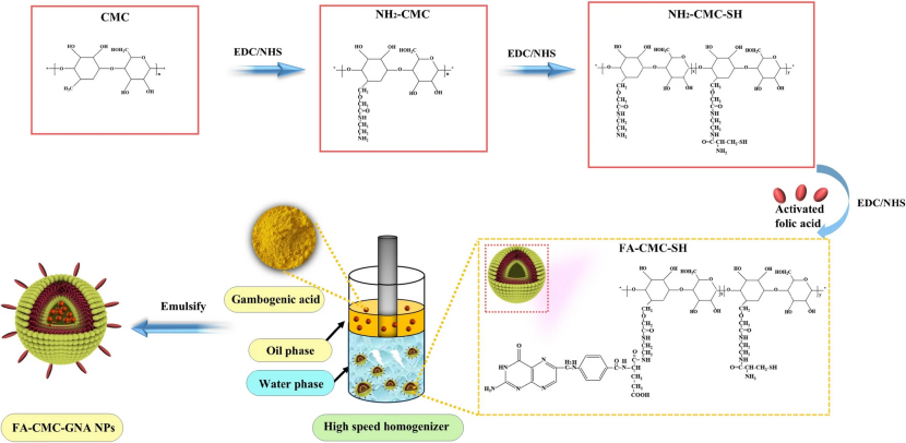 叶酸修饰负载新藤黄酸的羧甲基纤维素(CMC)纳米颗粒是一种具有靶向性与肿瘤微环境响应能力的智能纳米药物递送系统。该系统以CMC为基体材料,通过二硫键交联形成稳定的纳米颗粒结构,并高效包载具有显著抗肿瘤活性的天然产物新藤黄酸(new gambogic acid)。表面修饰的叶酸可特异性识别肿瘤细胞表面高表达的叶酸受体(FOLR1),促进靶向细胞的受体介导内吞,增强药物在肿瘤部位的富集。在肿瘤细胞内高谷胱甘肽(GSH)环境中,CMC纳米颗粒的二硫键结构被还原断裂,触发药物的快速释放,而在正常组织的低GSH浓度条件下结构稳定,降低药物泄漏与毒副作用。该系统兼具靶向递送、控释释放与生物相容性优势,为新藤黄酸在肿瘤精准治疗中的应用提供了有效载体。