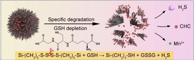 透明质酸修饰、负载乳酸转运抑制剂α-氰基-4-羟基肉桂酸(CHC)的Mn²⁺掺杂树枝状介孔有机硅纳米粒子是一种肿瘤微环境响应型多功能纳米治疗平台。该系统以具有高比表面积和良好生物相容性的树枝状介孔有机硅(DMOM)为载体,掺杂Mn²⁺以增强化学动力学治疗(CDT)效应,同时将CHC通过缩合反应负载于其孔隙和表面,实现对乳酸转运体(MCT)的抑制,从而切断肿瘤细胞间的代谢共生机制。在外层进一步修饰透明质酸(HA),利用其对肿瘤细胞表面CD44受体的亲和力实现主动靶向,增强肿瘤部位的富集能力。该纳米粒可在肿瘤内高谷胱甘肽(GSH)浓度下特异性降解,促使Mn²⁺和CHC协同释放,同时产生大量H₂S气体,造成肿瘤细胞酸中毒、ATP耗竭和免疫微环境重编程。通过破坏乳酸代谢、增强氧化应激和激活免疫系统,该平台实现了多通路协同的精准抗肿瘤治疗。