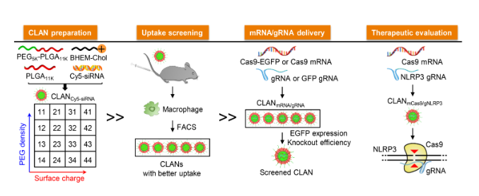 阳离子脂质辅助的聚合物纳米颗粒(PEG-PLGA + DOTAP)是一种高效的CRISPR/Cas9递送系统,通过将FDA批准的聚合物PEG-PLGA与阳离子脂质DOTAP复合,形成结构稳定、负载能力强的纳米颗粒,可用于递送Cas9 mRNA与靶向gRNA,实现体内基因编辑。该系统通过双乳化法制备,利用DOTAP提供的正电荷增强与负电性的核酸复合能力,促进其被靶细胞如巨噬细胞、T细胞和肿瘤细胞高效摄取。在递送至细胞内后,Cas9 mRNA被翻译成功能性核酸酶,与gRNA组装成CRISPR/Cas9复合物,对特定位点进行切割,实现基因敲除或修复。该平台在靶向敲除NLRP3等致病基因、调控炎症反应方面显示出显著疗效,为基因治疗提供了安全、可控且高效的递送工具。