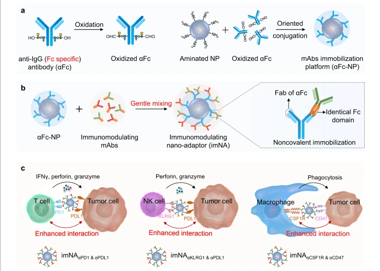 通过将两种不同的单克隆抗体(mAbs)同时修饰在金纳米颗粒、PLGA纳米粒、介孔硅或量子点等纳米载体表面,可构建具备双特异性识别功能的智能纳米系统。该策略常依赖于抗IgG Fc特异性抗体(αFc)作为通用偶联桥梁,借助其对所有mAb Fc区的高度特异性识别,在温和条件下实现抗体的定向、可控固定。双抗修饰的纳米颗粒能够模拟双特异性抗体,协同识别两种细胞表面抗原或调节分子,从而增强免疫细胞(如T细胞、NK细胞或巨噬细胞)与肿瘤细胞之间的相互作用,提升靶向性和细胞毒性。该系统还可结合成像或药物递送功能,赋予纳米颗粒多功能化能力,在肿瘤免疫治疗、联合治疗和精准诊疗等方面展现出广泛的应用前景。