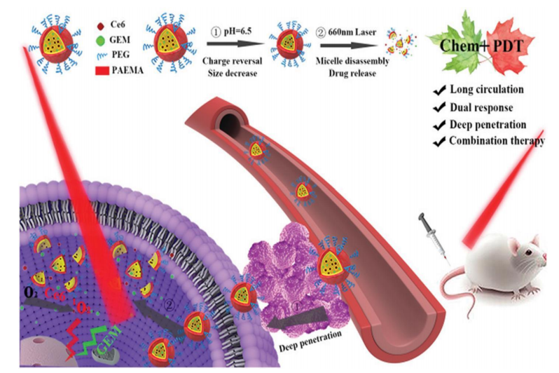 聚乙二醇(PEG)修饰的聚(2-(二甲氨基)乙基甲基丙烯酸酯)(PAEMA)纳米颗粒是一种多功能智能药物载体,负载化疗药物吉西他滨(Gemcitabine, GEM)和光敏剂二氢卟啉e6(Ce6),旨在实现肿瘤的联合化疗与光动力治疗。该纳米颗粒在生理条件下具有较好的稳定性和长循环特性,PEG修饰有效减少免疫清除,提升血液中滞留时间;同时PAEMA聚合物具备pH响应性,在肿瘤酸性微环境(pH < 6.8)下发生质子化和电荷反转,促使纳米颗粒解聚并释放吉西他滨和Ce6,实现精准控释。Ce6在660 nm激光激活下产生活性氧,协同吉西他滨发挥抗肿瘤效应,纳米颗粒尺寸的缩小有助于药物深层穿透肿瘤组织,显著增强治疗效果并降低系统性毒性,展现出优异的肿瘤治疗潜力。