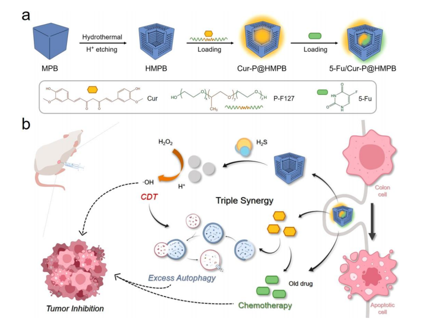 中空介孔普鲁士蓝(HMPB)纳米颗粒是一种高效的多功能药物递送平台,用于共载临床化疗药物5-氟尿嘧啶(5-Fu)和天然抗癌活性成分姜黄素(Cur)。该载体具备中空结构和介孔特性,赋予其高载药量和优异的药物保护能力,同时实现药物的控释。HMPB本身具有低芬顿反应催化活性,但在肿瘤微环境中通过原位硫化转变为高活性的普鲁士白(Prussian White, PW),显著增强芬顿反应,产生大量羟基自由基(•OH),激活化学动力学治疗(CDT)并诱导肿瘤细胞自噬。释放的姜黄素不仅促进肿瘤细胞自噬死亡,还显著增敏5-Fu的抗肿瘤效果,三者协同发挥抗癌作用。该系统依托肿瘤特异性微环境实现响应性药物释放与多重治疗机制的整合,展现出优异的结直肠癌治疗潜力和临床转化价值。