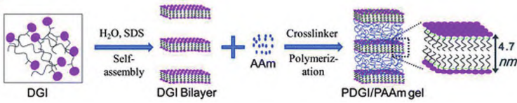 双甘油酯(DGI)是一种具有良好生物相容性的脂质材料,常用于自组装和药物递送,而聚丙烯酰胺(PAA)是一种广泛应用的合成聚合物,具有优异的水合能力和力学性能,常用于制备水凝胶和生物材料。双甘油酯(DGI)-聚丙烯酰胺(PAA)水凝胶是一种新型的复合材料,通过将双甘油酯与聚丙烯酰胺结合而成,具有良好的生物相容性和调控释放特性。DGI作为一种脂质材料,能够自组装形成微观结构,提升水凝胶的力学性能和水合能力;而聚丙烯酰胺则提供了优异的柔韧性和强度,使得水凝胶在不同环境下能够保持稳定。此复合水凝胶不仅在药物递送系统中表现出良好的效果,还适用于组织工程和生物传感器等领域。