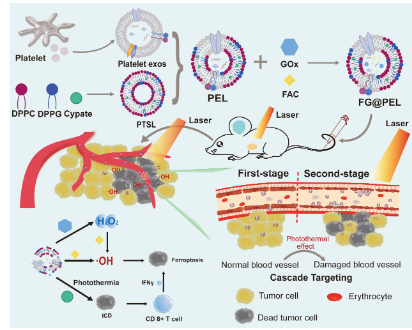 负载葡萄糖氧化酶(GOx)和柠檬酸铁铵(FAC)的血小板外泌体-光热敏感脂质体杂化纳米颗粒是一种创新的仿生给药系统,旨在提高肿瘤的靶向治疗效果。该纳米颗粒通过结合血小板外泌体的天然靶向性和光热敏感脂质体的热响应特性,能够精确靶向肿瘤区域并在光照刺激下释放药物。葡萄糖氧化酶(GOx)是一种酶,通过催化葡萄糖产生过氧化氢(H₂O₂),增强肿瘤微环境的酸性和药物的渗透性,而柠檬酸铁铵(FAC)是是一种含铁的化合物,可以通过Fenton反应生成有毒的羟基自由基(•OH),进一步加剧肿瘤细胞的杀伤效应。这种纳米颗粒系统能够在肿瘤区域实现协同治疗效果,通过光热治疗、药物释放与自由基生成的多重机制,显著提高肿瘤的治疗效果,同时减少对正常组织的副作用。