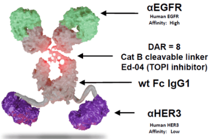 BL-B01D1 是一种由 EGFR×HER3 双特异性抗体和新型 DNA 拓扑异构酶 I 抑制剂 ED04(喜树碱类似物)通过可裂解连接子连接而成的抗体药物偶联物(ADC)。其抗体部分具有双重靶向能力,能够同时识别并结合肿瘤细胞表面过表达的 EGFR 和 HER3 受体。抗 EGFR 部分是高亲和力的 IgG1 型抗体,而抗 HER3 部分则由两个低亲和力的单链可变片段(scFv)组成。在该设计中,连接子起到了至关重要的作用,作为一个可裂解结构,它能够在肿瘤细胞内部的特定条件下释放细胞毒药物 ED04。ED04 是一种类似喜树碱的 DNA 拓扑异构酶 I 抑制剂,能够有效干扰肿瘤细胞的 DNA 复制与修复,导致细胞死亡。BL-B01D1 的双重靶向和药物递送系统,使其能够高效地将细胞毒素精确送到肿瘤细胞内,从而实现对 EGFR 或 HER3 表达的肿瘤的精准治疗,同时减少对正常组织的副作用,具有良好的治疗潜力和前景。