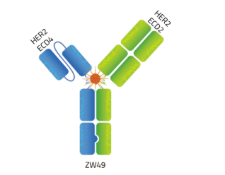 ZW49是一个创新的抗HER2双特异性抗体药物偶联物(ADC),由双特异性抗HER2 IgG1抗体ZW25与细胞毒性药物N-酰基磺酰胺auristatin通过蛋白酶可切割的接头连接而成。ZW25抗体能够同时识别并结合HER2的两个不同表位,从而实现更精准的靶向治疗。酶催化连接子设计使得有效载荷auristatin在进入癌细胞后能够通过内吞作用进入溶酶体并释放,从而发挥其强大的微管抑制作用,阻止肿瘤细胞分裂并诱导细胞死亡。ZW49通过这种双重靶向机制,提高了对HER2阳性肿瘤的治疗效力,同时减少了对正常细胞的毒性,展示了其在临床治疗中的潜力。