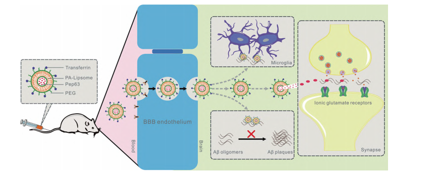 转铁蛋白(Tf)和对转铁蛋白受体(TfR)的亲和力,从而促进脂质体通过血脑屏障(BBB)。此外,脂质体的脂肽Pep63修饰的包载磷脂酸(PA)的脂质体是一种创新的多功能纳米递送系统,旨在改善阿尔茨海默病等神经退行性疾病的治疗效果。脂质体表面通过偶联转铁蛋白(Tf)以增强其质膜中掺入了磷脂酸(PA),提高了脂质体与淀粉样β蛋白(Aβ)的结合能力,尤其是对Aβ寡聚体和纤维的亲和性。肽Pep63则具有神经保护作用,能够靶向Aβ相关的病变并减轻神经毒性。这种多重修饰策略使得脂质体具备了靶向性、血脑屏障穿透能力和神经保护作用,从而为治疗阿尔茨海默病提供了一个有效的治疗方案。